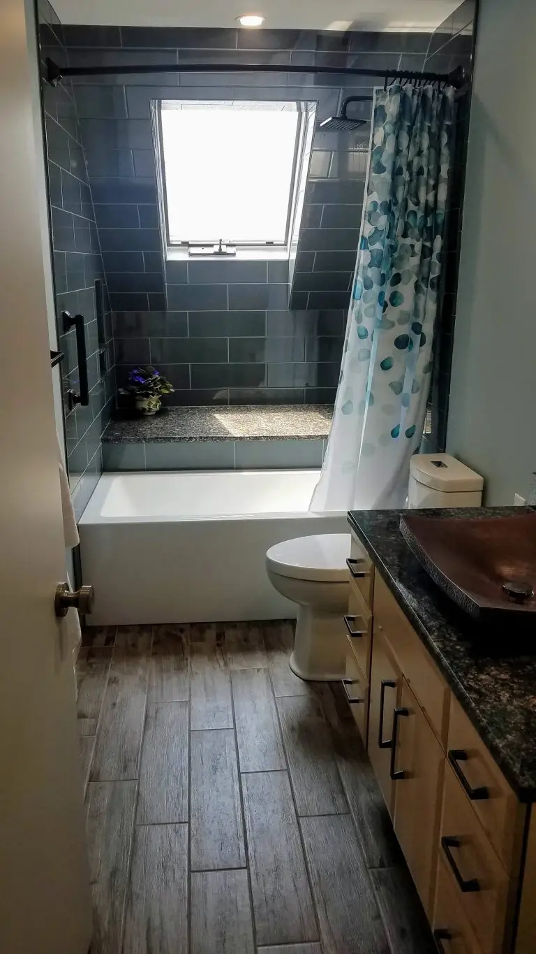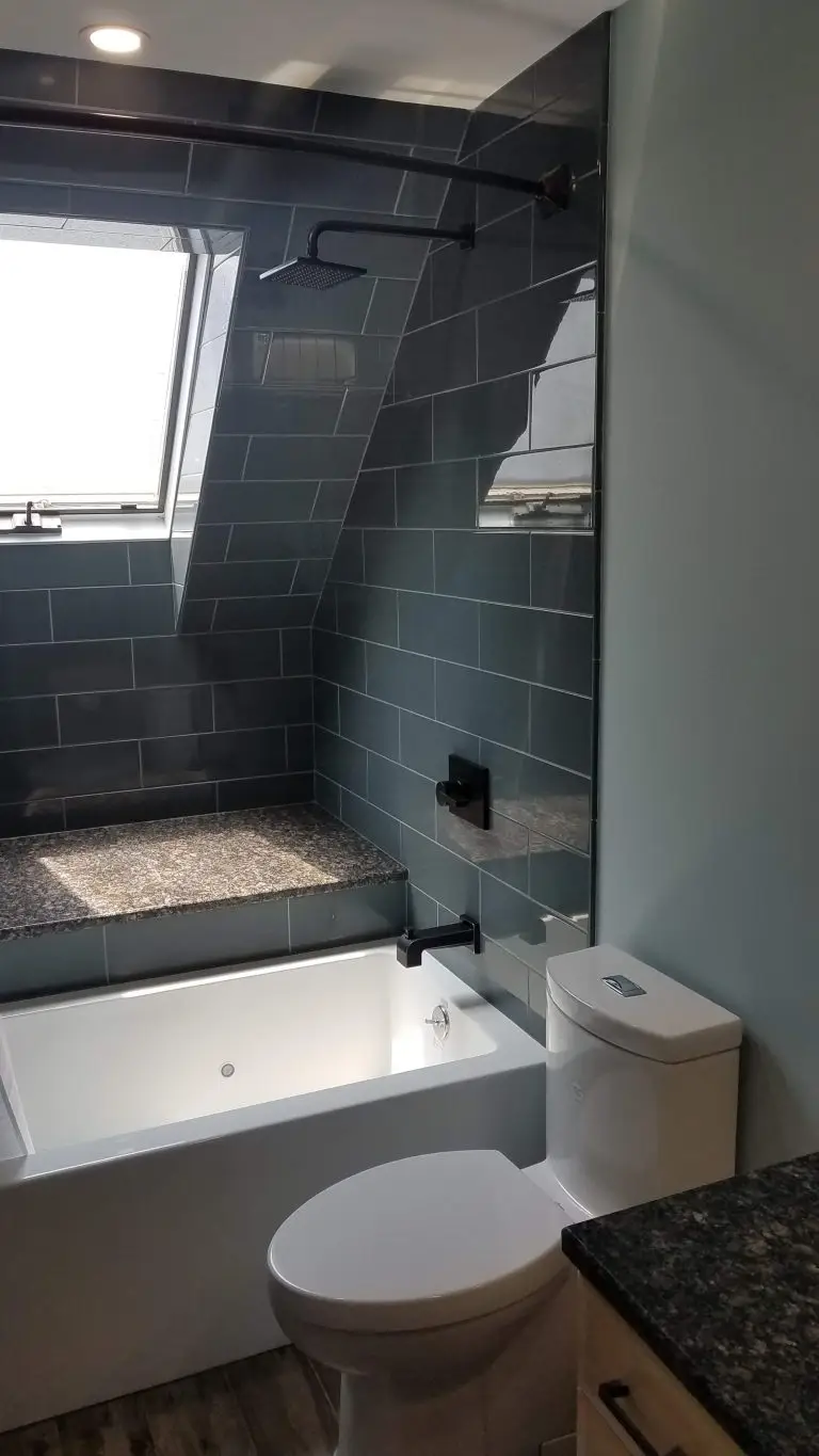 - Tilework: Shower walls in Merola River Blanco 12×24 with Vetro Marmi Black Brick decorative tile, shower floor in Daltile Linden Point Grigio 2×2, bathroom floor in Merola River Grafito 12×24.