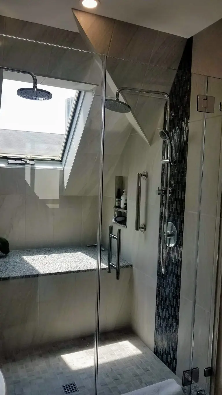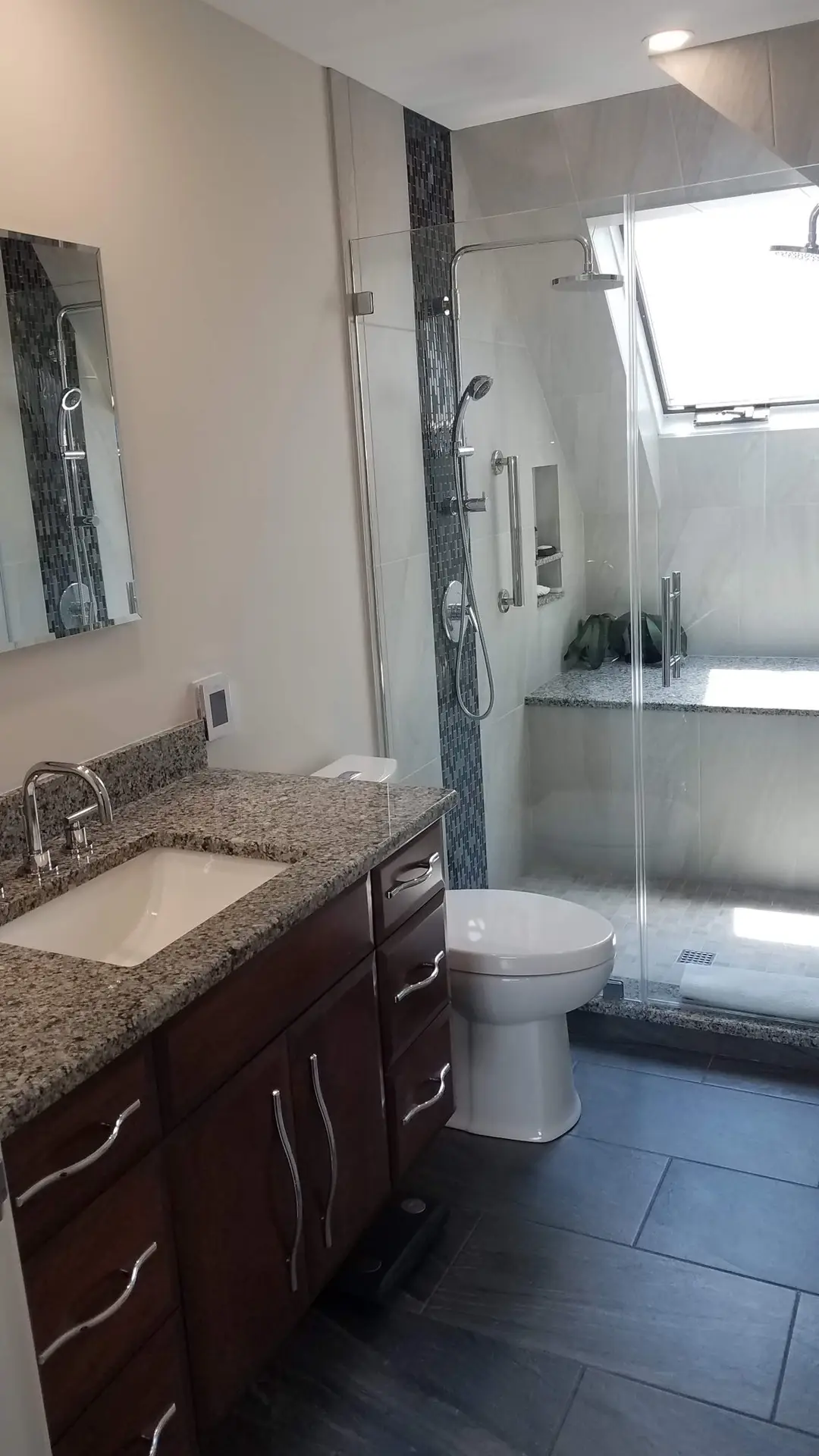 - Countertops & Surfaces: Azul Platino granite for vanity top, shower threshold, and bench seat.
