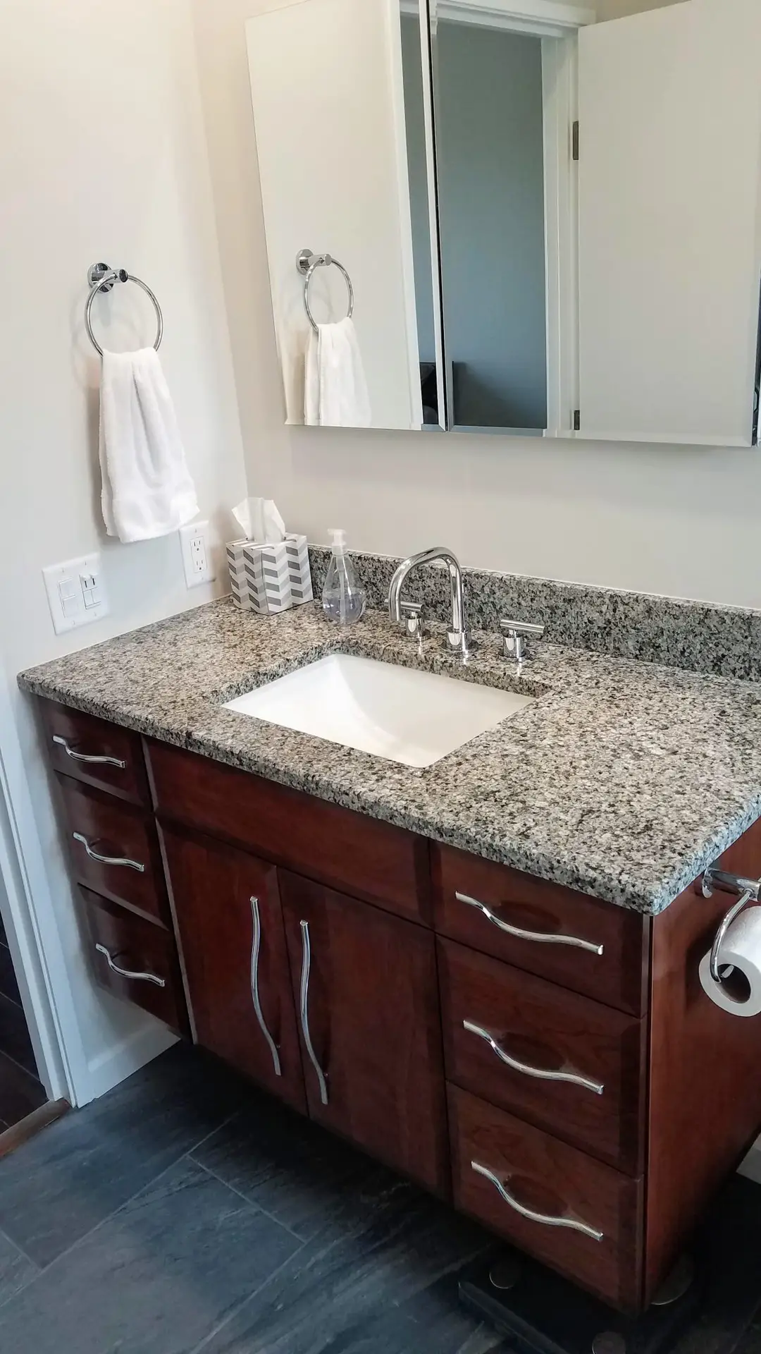 - Vanity & Hardware: Custom floating vanity from Holiday Kitchens in Contemporary door style with 375 edge, Cherry wood with County Hearth stain, accented with Top Knobs Somerdale hardware in chrome.