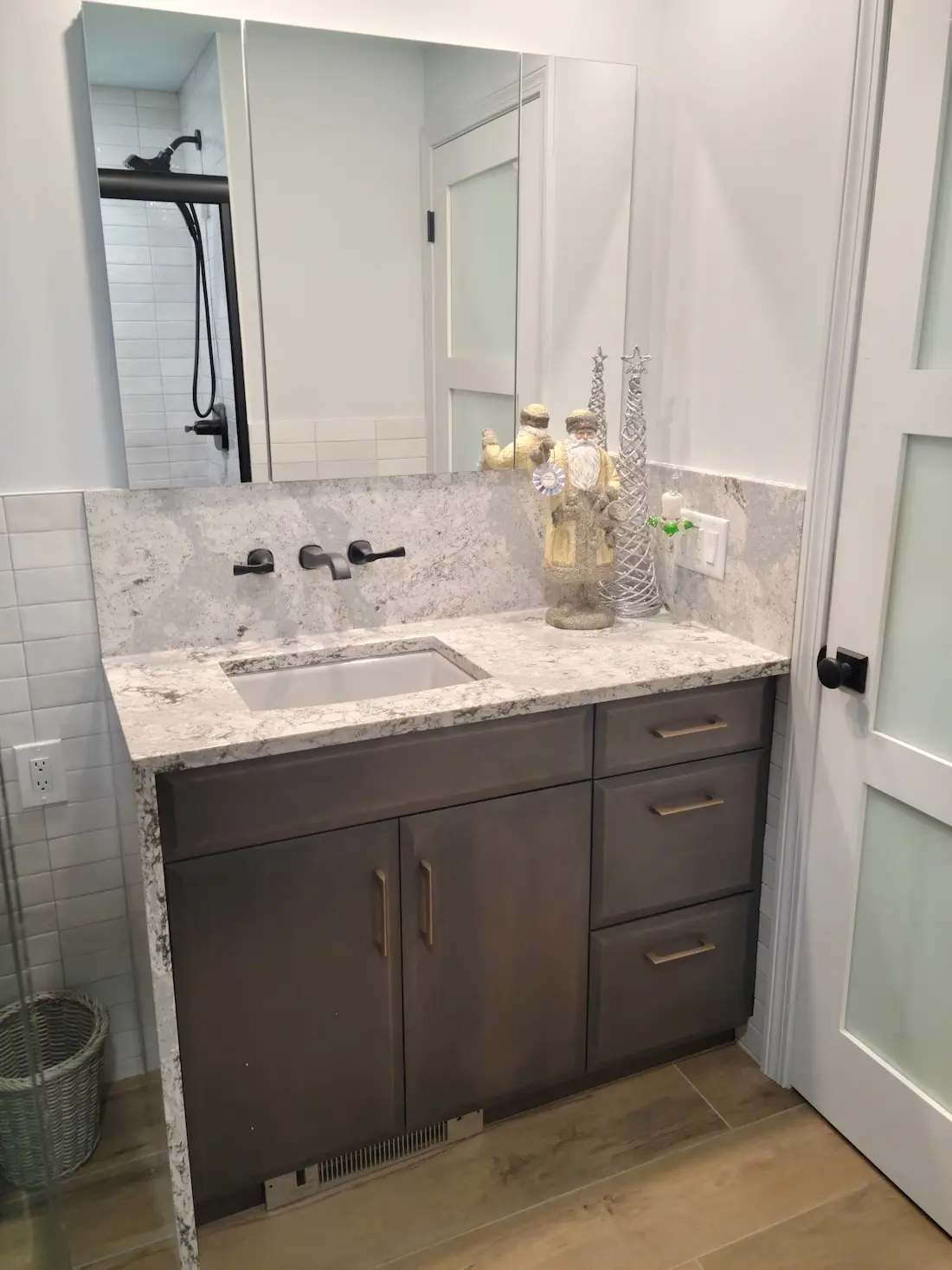 - Vanity & Storage: Holiday Kitchens frameless vanity in Contemporary door style with 375 edge in Maple Granite, paired with Top Knobs Holland Pulls in Honey Bronze.