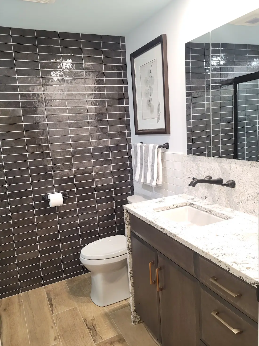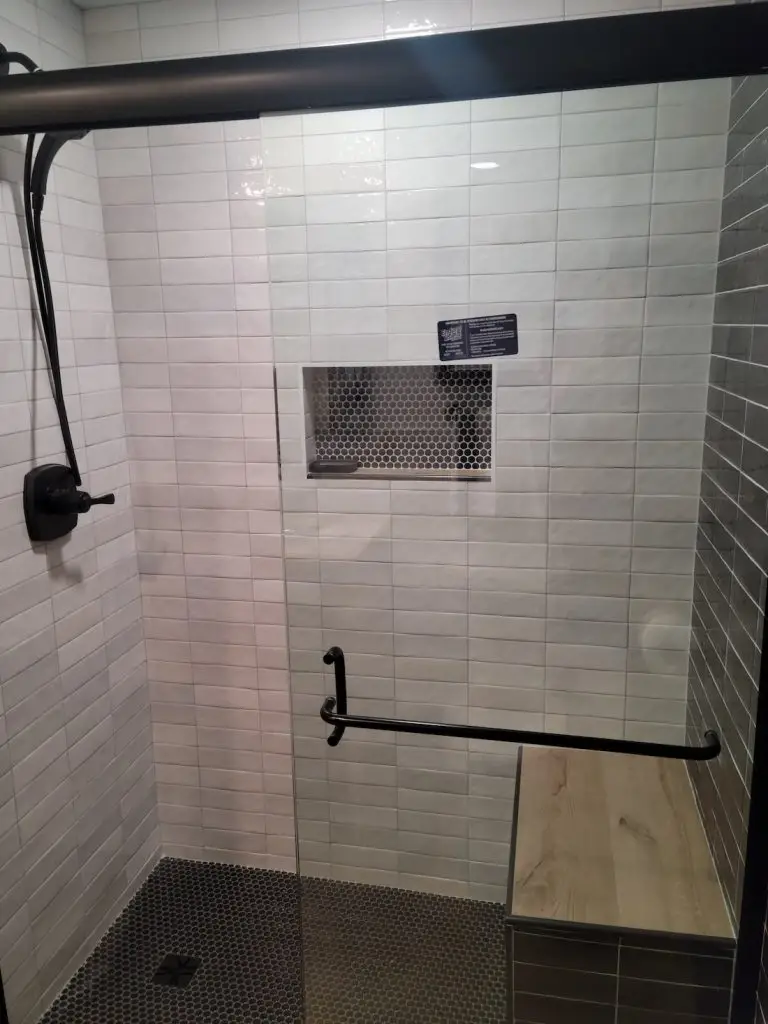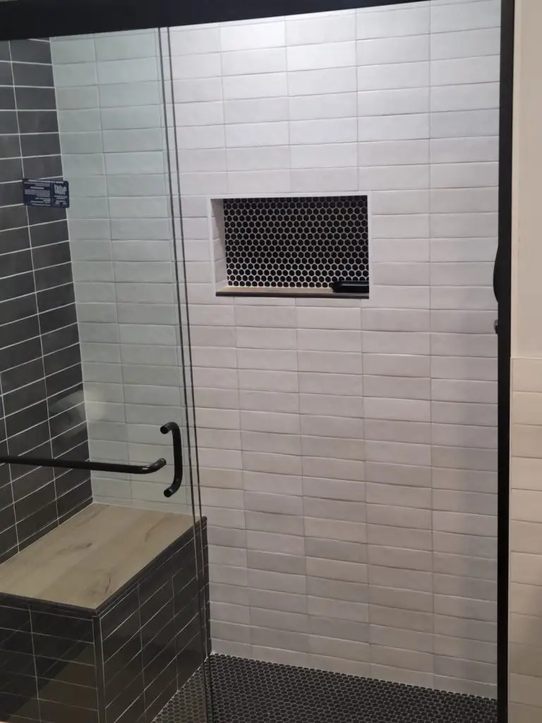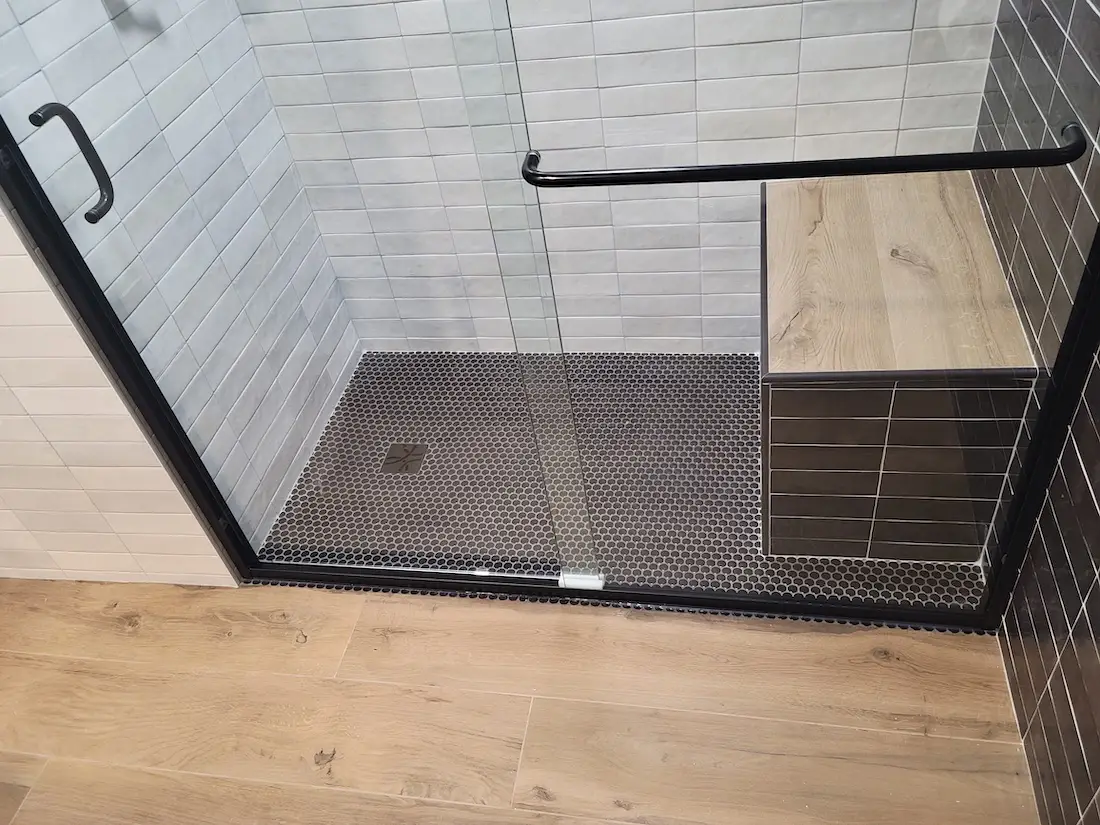 waterproofing system with a bench seat and tiled niche. Walls feature Equipe Artisan Tile in Graphite and White 2.5×8 with Schluter trim; the floor is finished with Black Geometric Penny Round tile. - Flooring: Belmont Wood 8×48 tile for warmth and continuity throughout the bathroom.