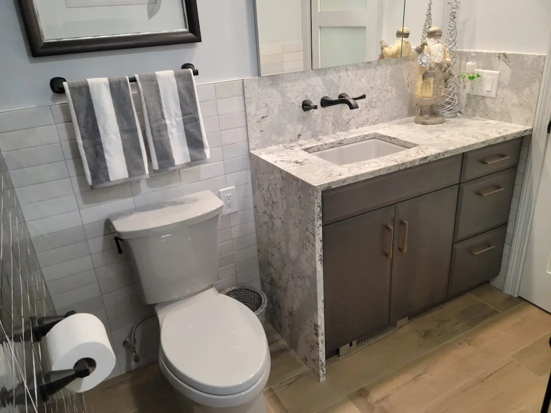- Toilet: Kohler Corbelle comfort height 2-piece with soft-close seat.