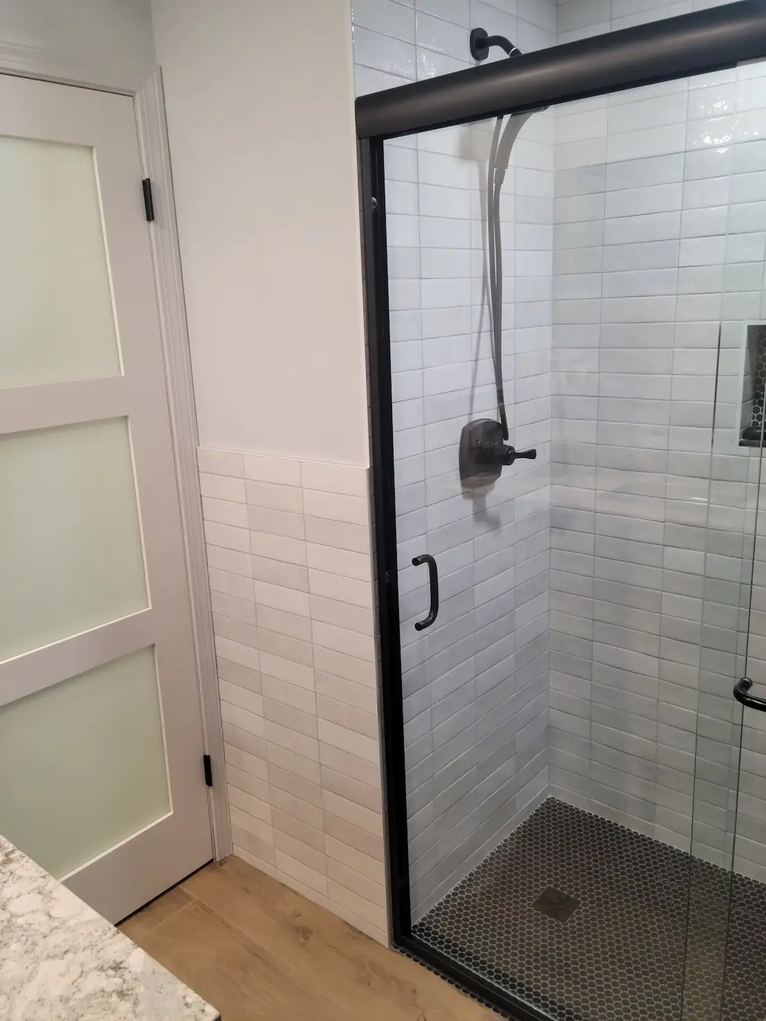 - Shower Door: Easco Image Plus sliding door in 3/8” clear glass with matte black hardware, featuring a header, 6” Euro handle, and towel bar.