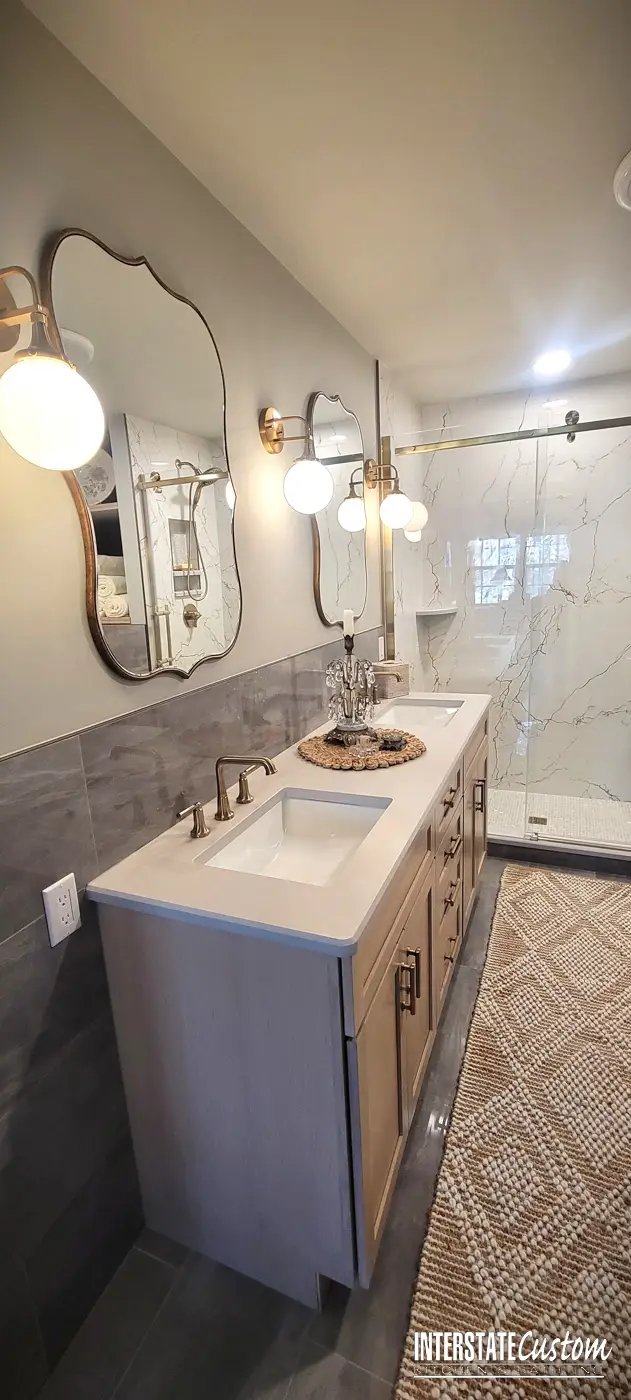 Countertops & Surfaces MSI Q Quartz surfaces throughout, including vanity countertops and shower components, finished in Soapstone Mist Concrete with refined 1/4″ bevel edge detailing.