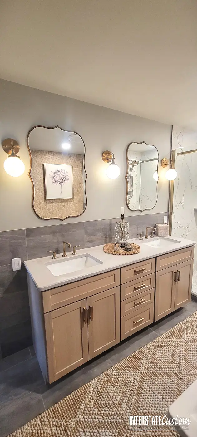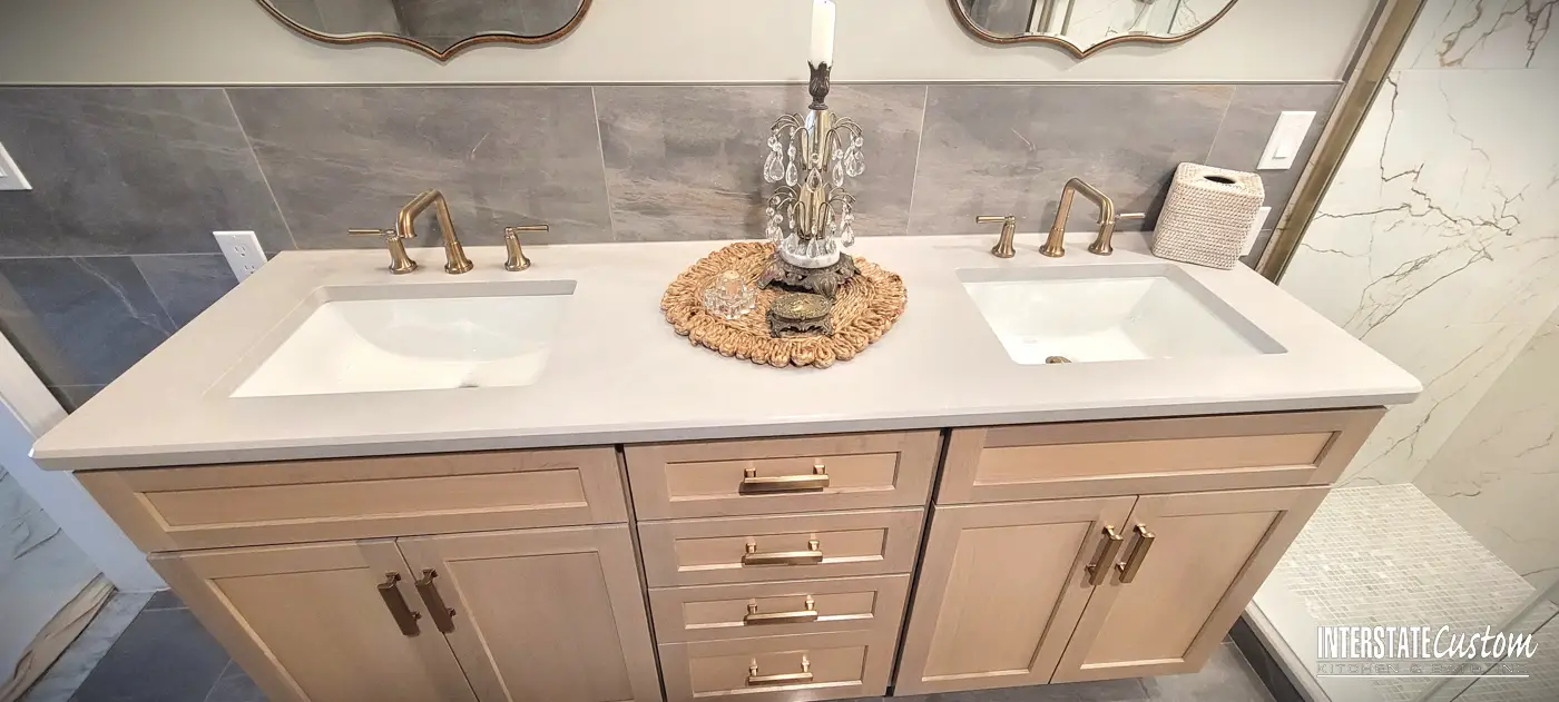 Cabinetry & Storage The design features a Dura Supreme double vanity with coordinating floating shelves, showcasing the Hudson door style in Quartersawn Oak with an elegant Alabaster finish.
