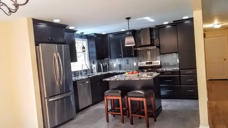 - Cabinets: Holiday Kitchens frameless Contemporary Door cabinets in Maple Espresso and a Custom Blue Stain bring a unique mix of rich, dark tones and bold color, giving the kitchen a sleek, modern appearance.