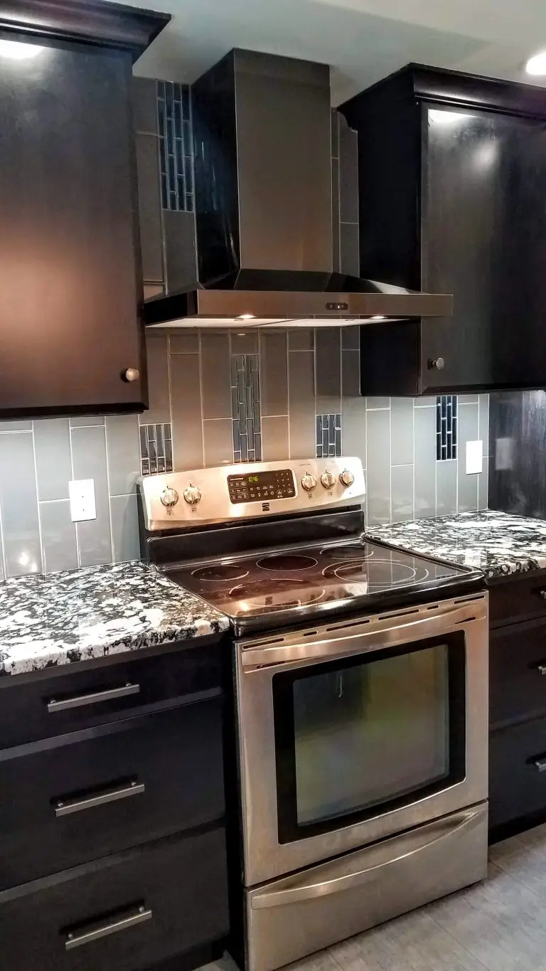 - Backsplash: Daltile Elevare Carbon tile with Merola Tile Blue Mirror Beveled Edge Mosaic creates a stunning visual effect, providing depth and sophistication to the kitchen’s design.