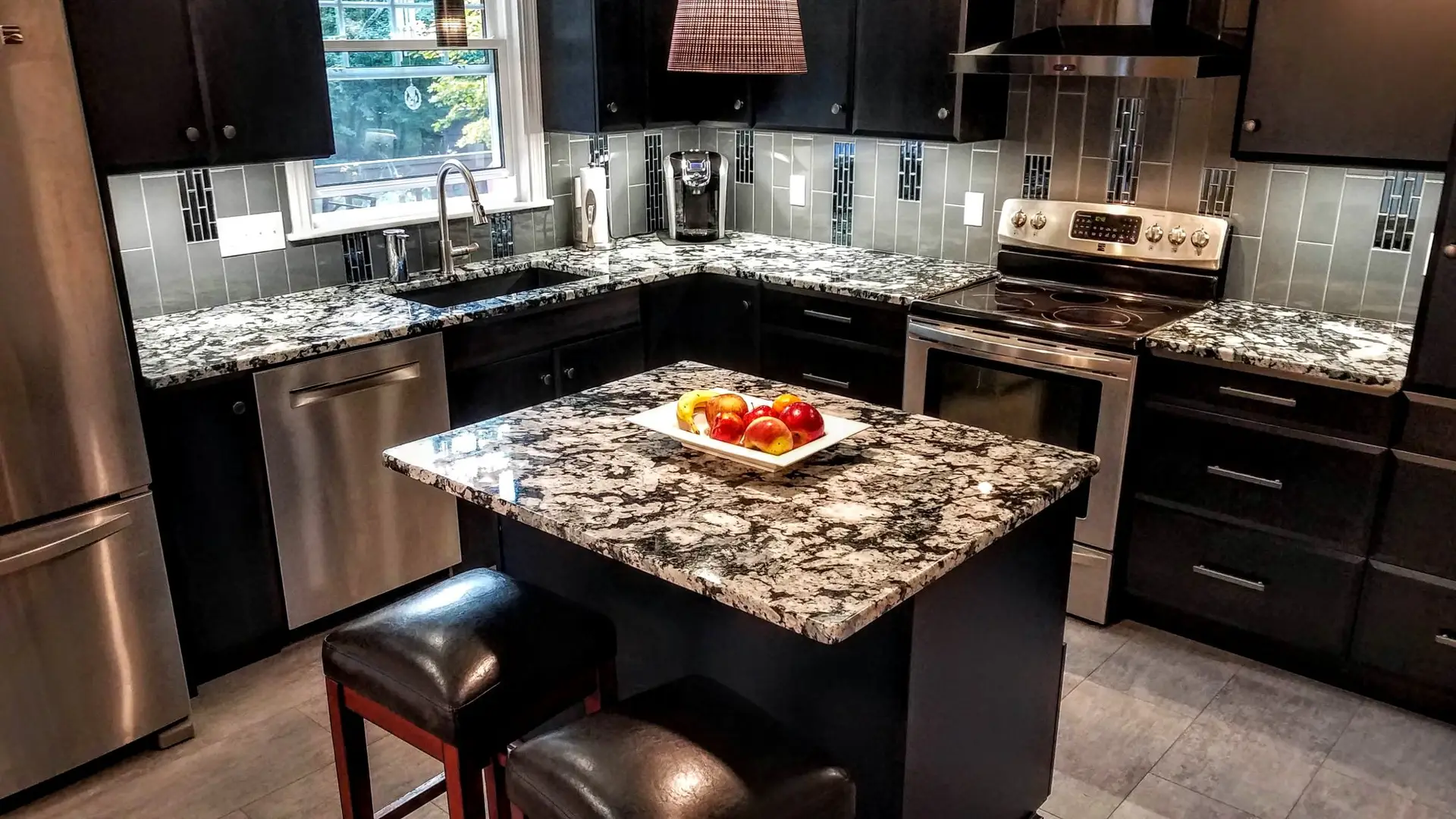 In 2019, we completed a kitchen remodel in East Hampton, CT, that radiates modern elegance with a glamorous twist. This space combines rich cabinetry, striking granite countertops, and detailed design elements to create a kitchen that is both functional and luxurious.