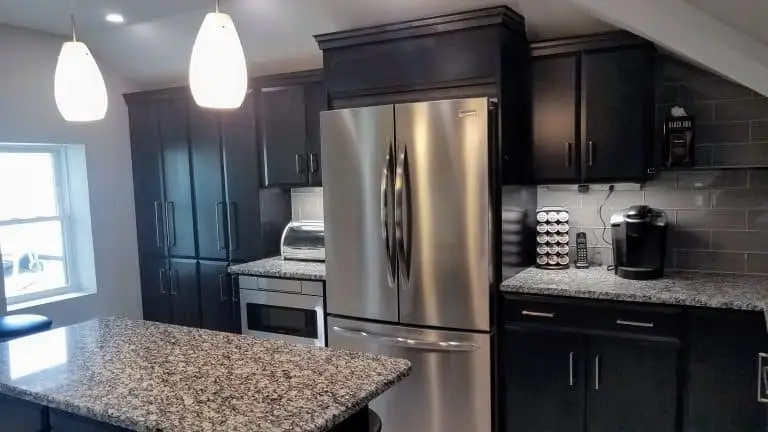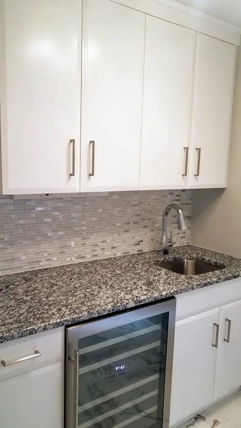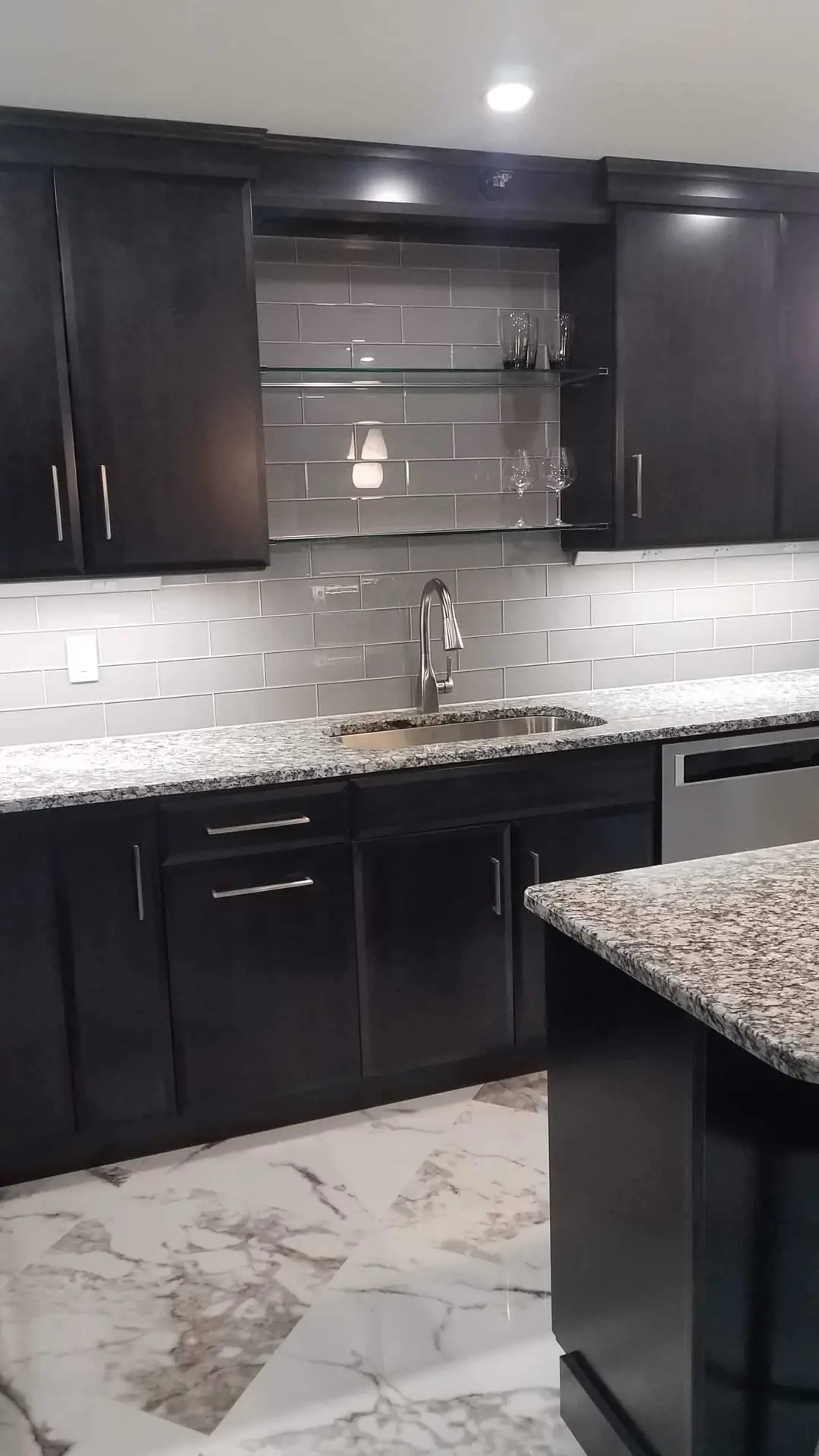 - Countertop: White Mist granite countertops add a striking, clean aesthetic that perfectly balances the dark and light cabinetry, offering a modern yet timeless feel.