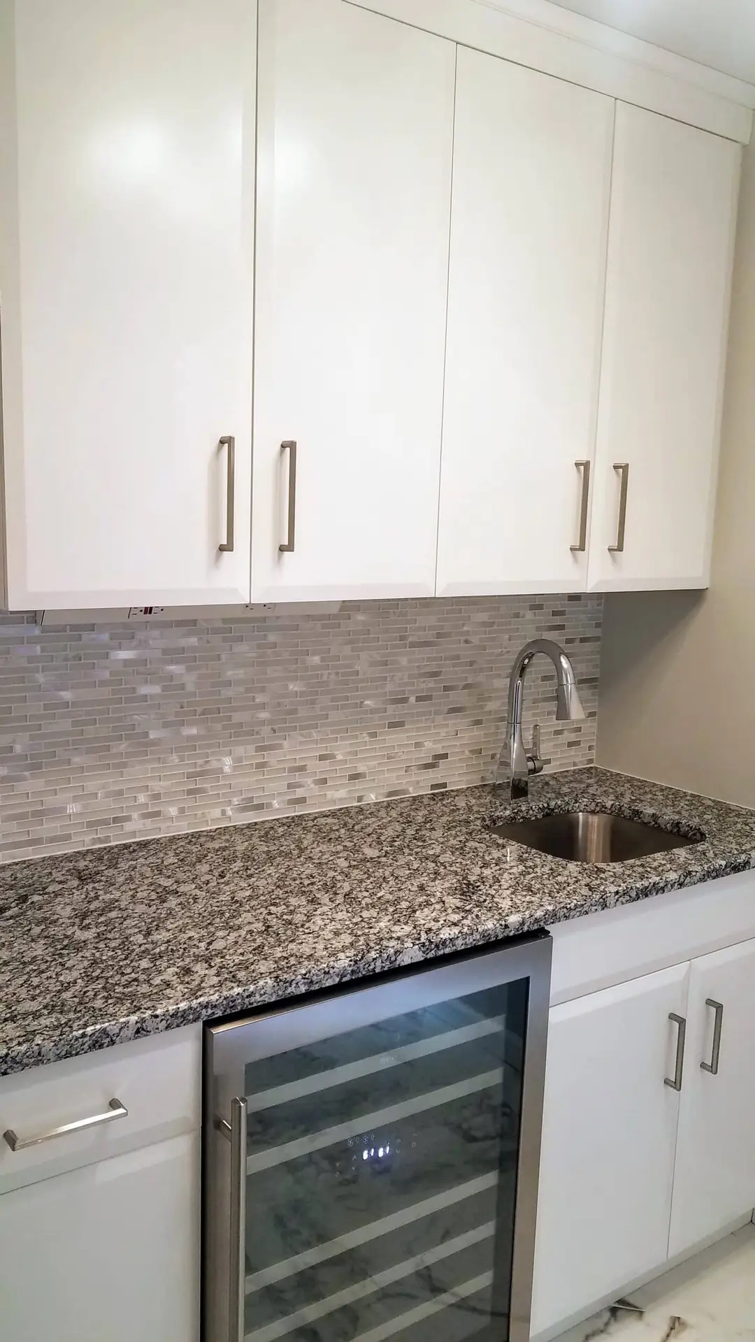 - Backsplash: The kitchen features Merola Tile Gotham Grey Glass backsplash, providing a clean, contemporary backdrop, while the butler’s pantry showcases a Vetro Marmi Carrera & Steel Mosaic, creating a dynamic and luxurious visual.