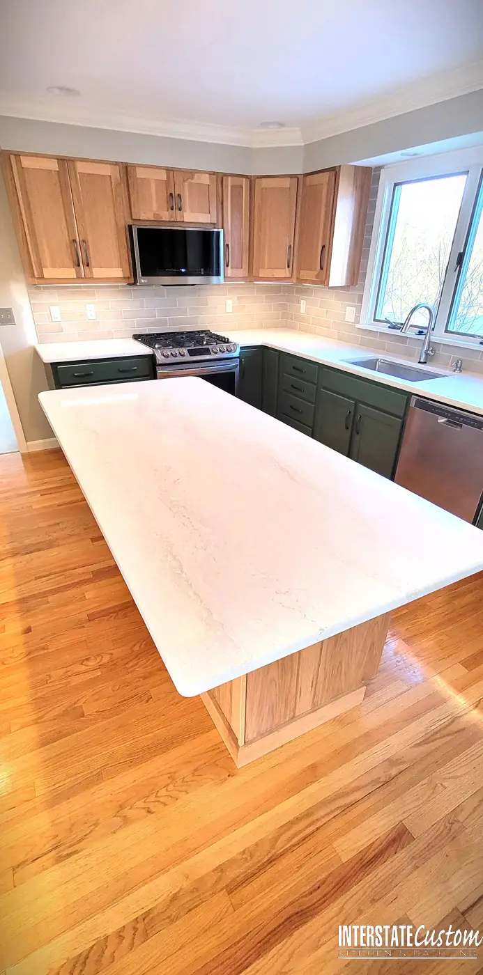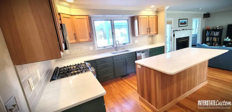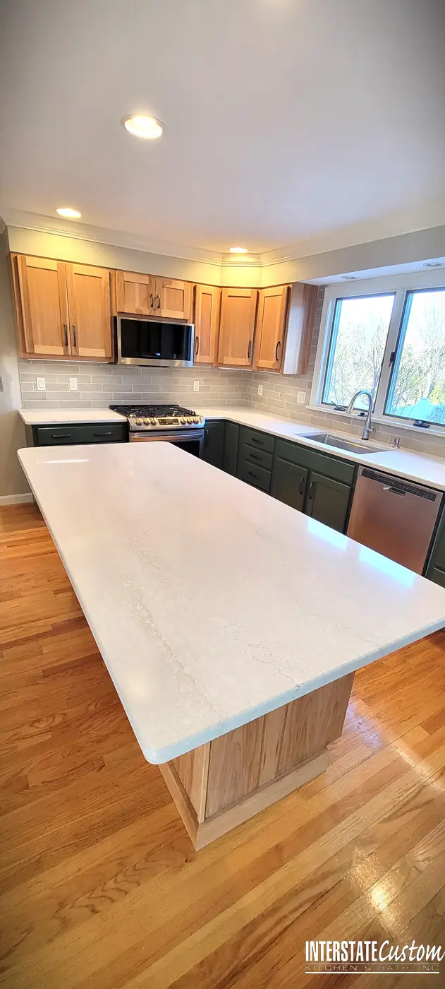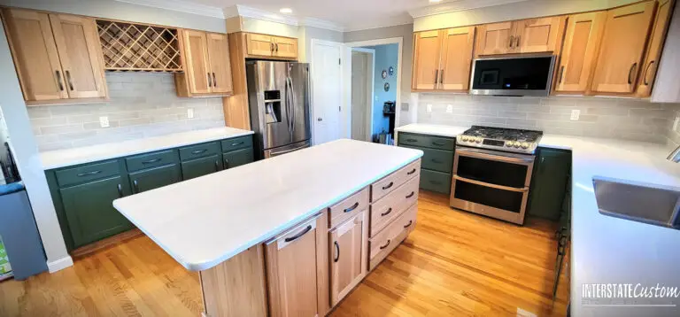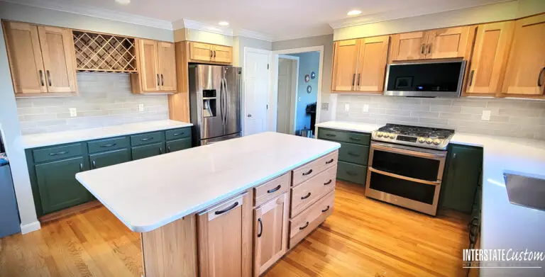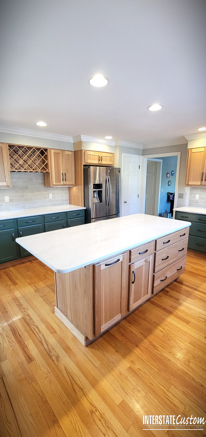 This South Hadley, MA, kitchen underwent a beautiful transformation, blending natural warmth with custom elegance. The upper cabinets and island feature a rich Hickory Honey finish, while the lower cabinets bring a striking contrast with a custom paint match to Benjamin Moore HC-121 Peale Green, creating a balanced and inviting aesthetic.