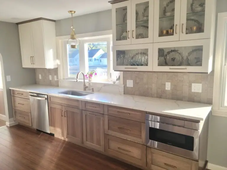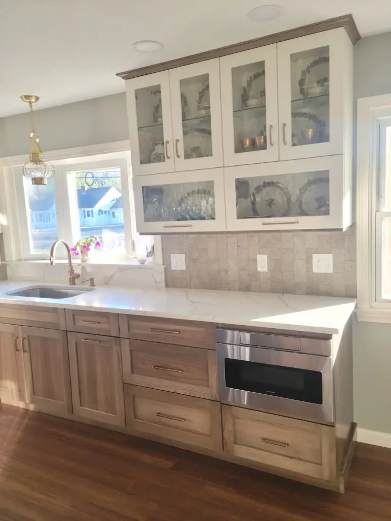 This Agawam kitchen remodel combines modern elegance with practical design, featuring a two-tone cabinetry style that adds a delightful touch to a timeless space.